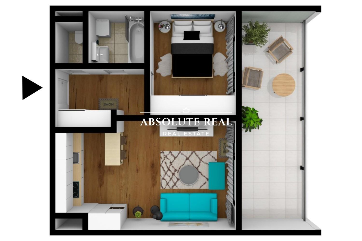 - Dispozícia: obývacia izba spojená s kuchyňou, spálňa, vstupná predsieň, WC, kúpeľňa, terasa