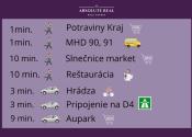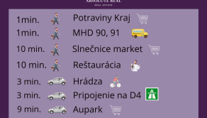 - Výborná občianska vybavenosť - Slnečnice market, banka, pošta, MHD, nemocnica, základná škola