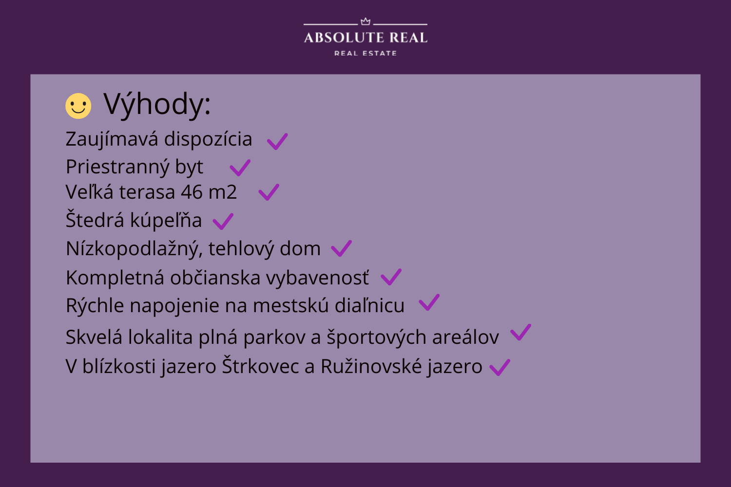 Realitná kancelária ABSOLUTE REAL v zastúpení majiteľa predáva 3 izbový byt o rozlohe 60 m2 vrátane pivnice (2.4 m2) a terasu o veľkosti 46 m2, ktorá patrí k bytu ale nie je vo vlastníctve majiteľa, v lokalite Bratislava Ružinov-Trávniky na ulici Astrová.